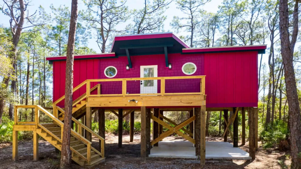 Specifications The Floor Plan Details This single-story cabin has a modern look with bold red ...