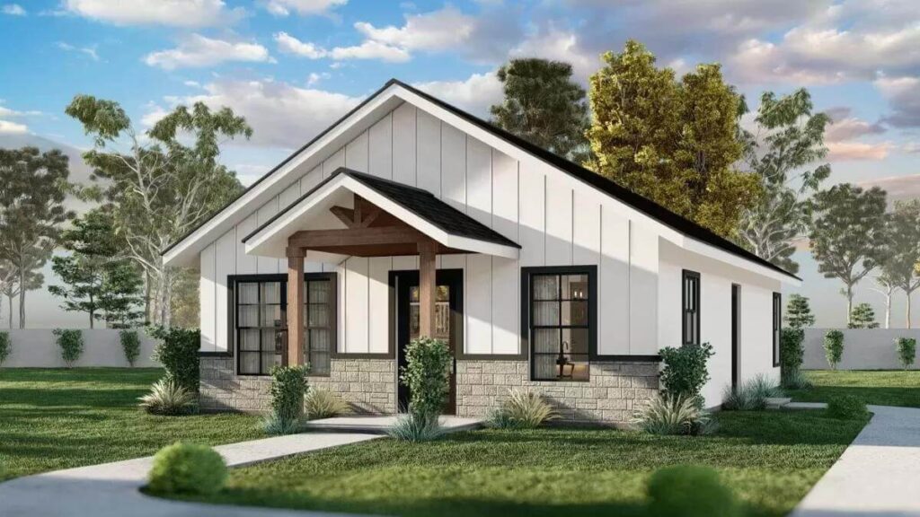 Here’s a cozy modern farmhouse cottage that’s both charming and practical. It has 963 square ...