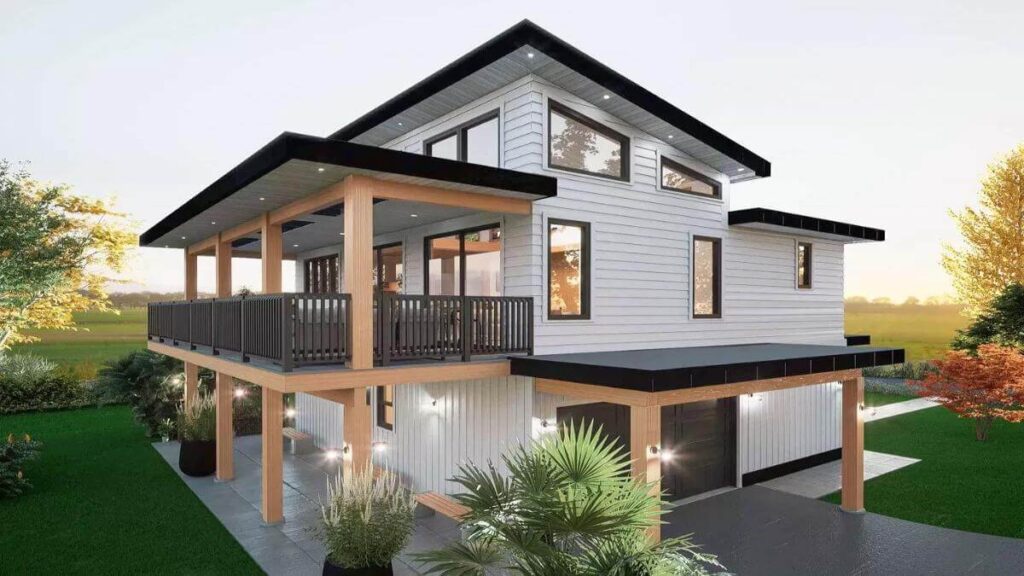 READ MORETwo-Story Modern 2-Bedroom Home with Open Living Space and Wraparound Porch (Floor Plan)