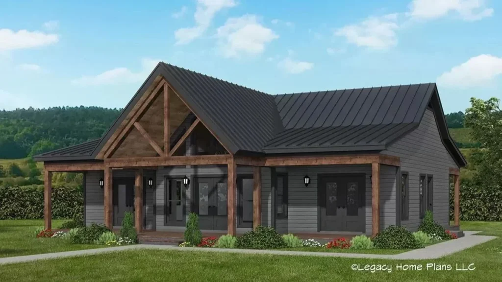 Specifications Details This 2-bedroom modern barndominium has a cozy, rustic feel. It features angled roofs, ...