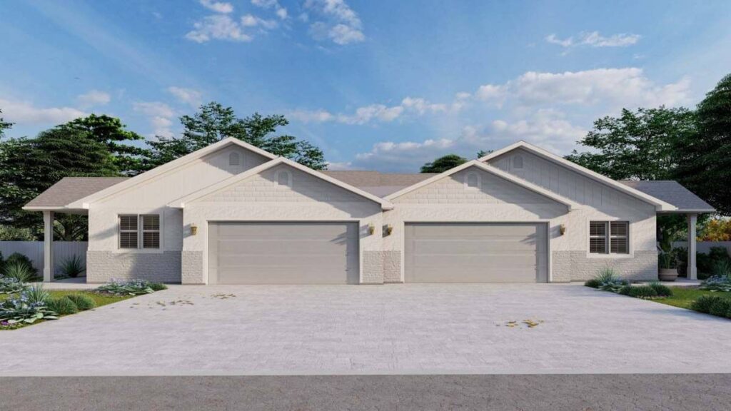 READ MORE2-Bedroom Southern Style Single-Story Duplex Home with Open Living Space and Double Garage (Floor Plan)
