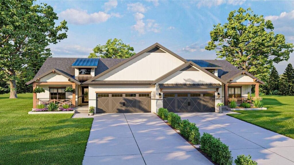 Specifications Details This modern farmhouse-style duplex has craftsman details, like board and batten siding, metal ...