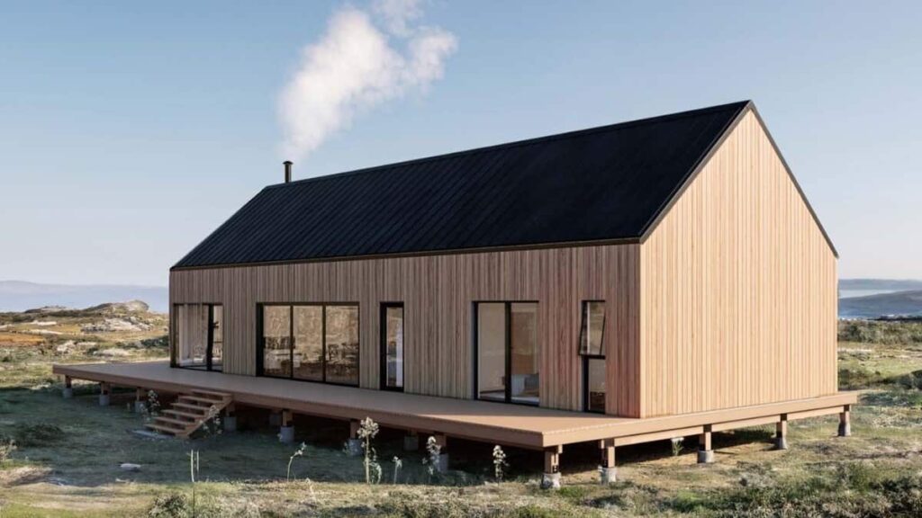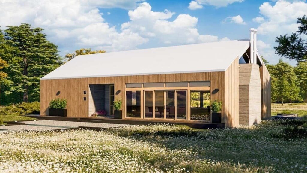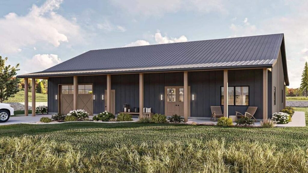Specifications Details This 2-bedroom barndominium has a modern look with vertical siding, a sloping roof, ...