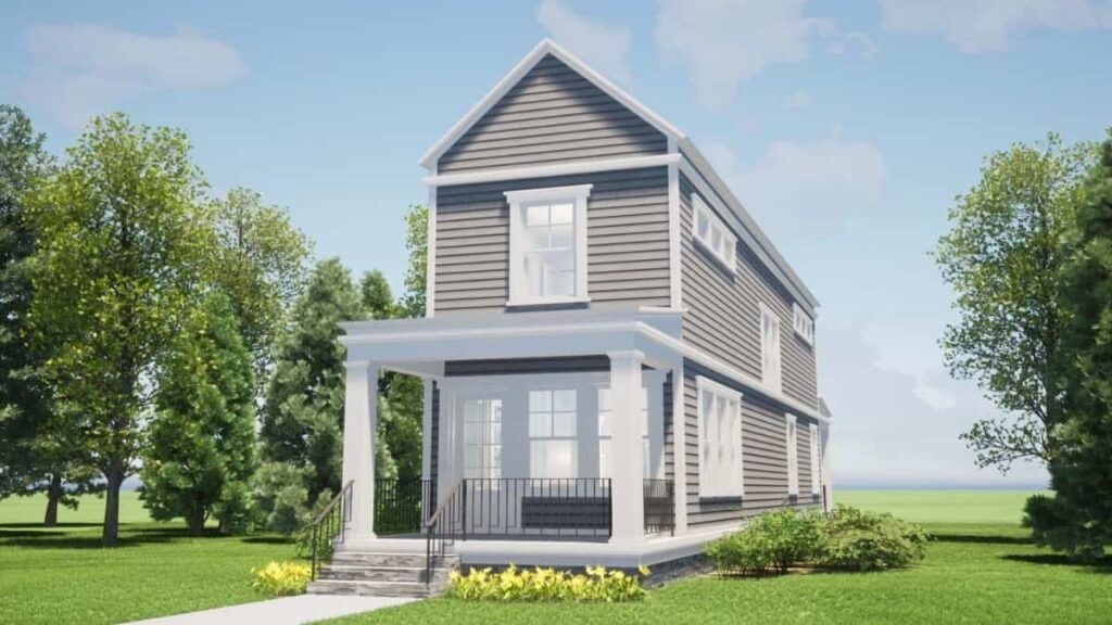 Two-Story Country Style 2-Bedroom Home for a Narrow Lot with 8-Foot-Deep Front Porch (Floor Plan)