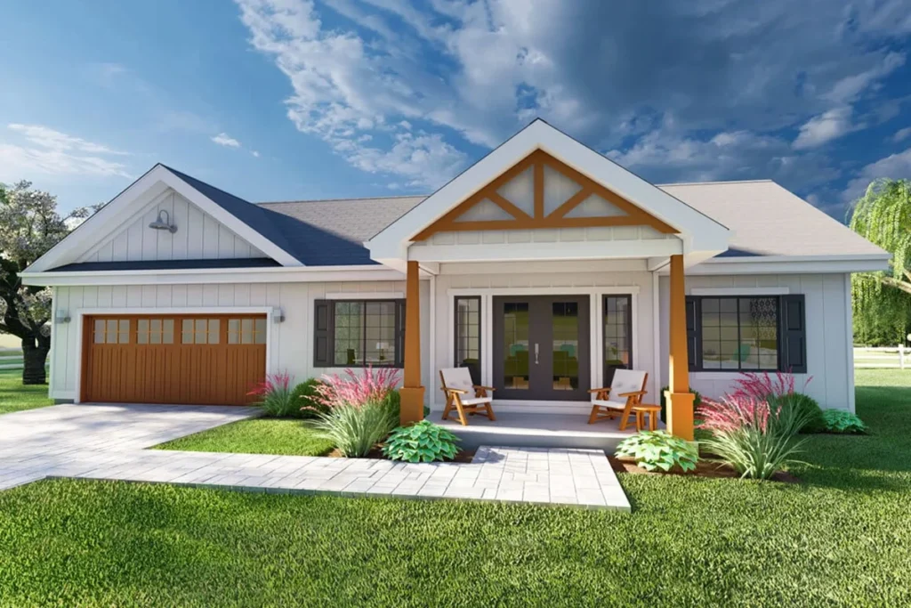 READ MORESingle-Story 2-Bedroom Modern Rustic Home with Front Porch and Open Concept Design (Floor Plan)