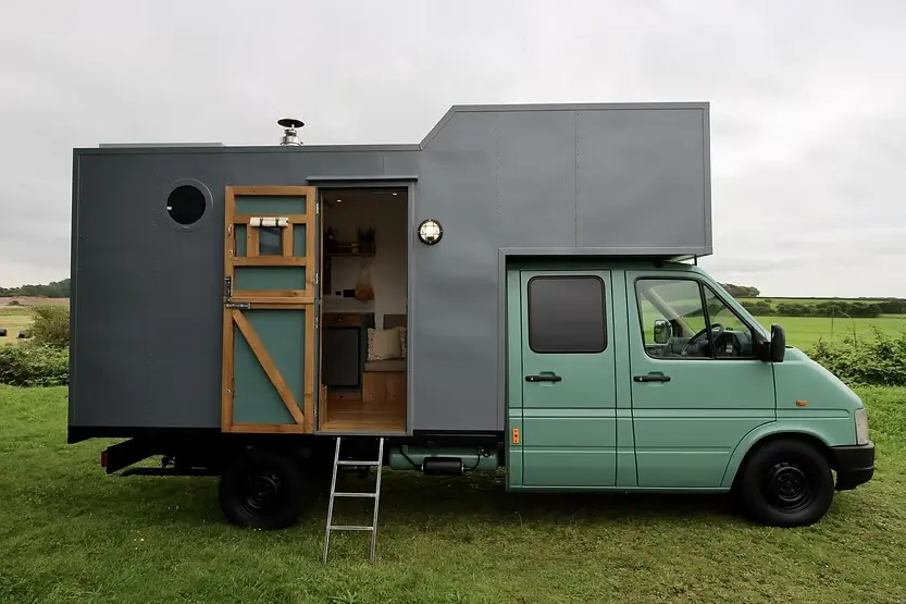This van has a bright and roomy inside, made with old wooden floorboards and walls ...