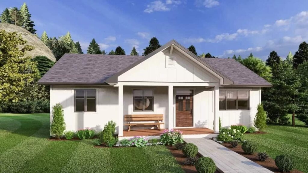 This 2-bedroom rancher home has a lovely country look with board and batten siding, a big gable in the center, and a welcoming front porch with fancy columns.
