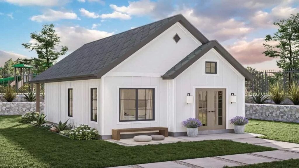 This 1-bedroom cabin style ADU features board and batten siding, gable rooflines, and wood accents for a charming look.