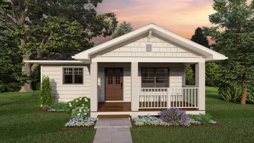 This single-story ADU cottage has a charming look with horizontal lap siding, cedar shake details, and a gabled front porch with white railings and columns.