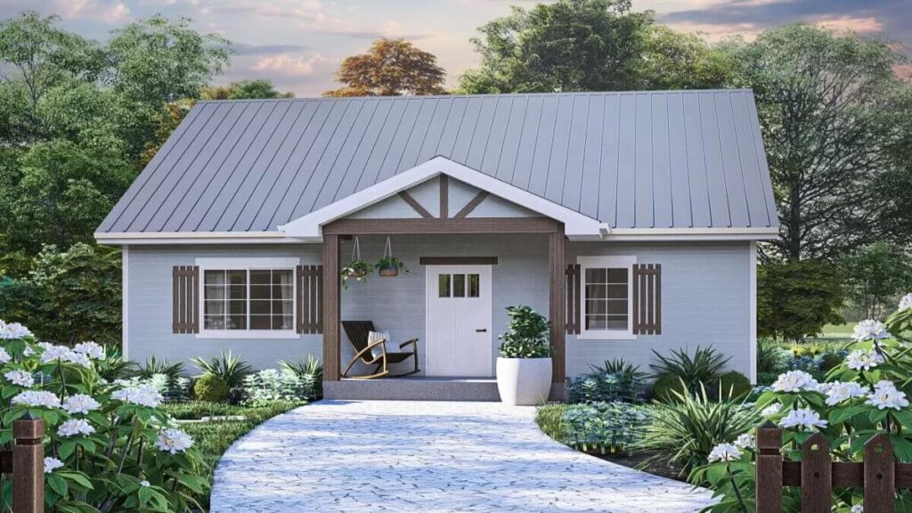 This charming 2-bedroom cottage has cute shuttered windows, clapboard siding, and a welcoming gabled front porch with visible beams.