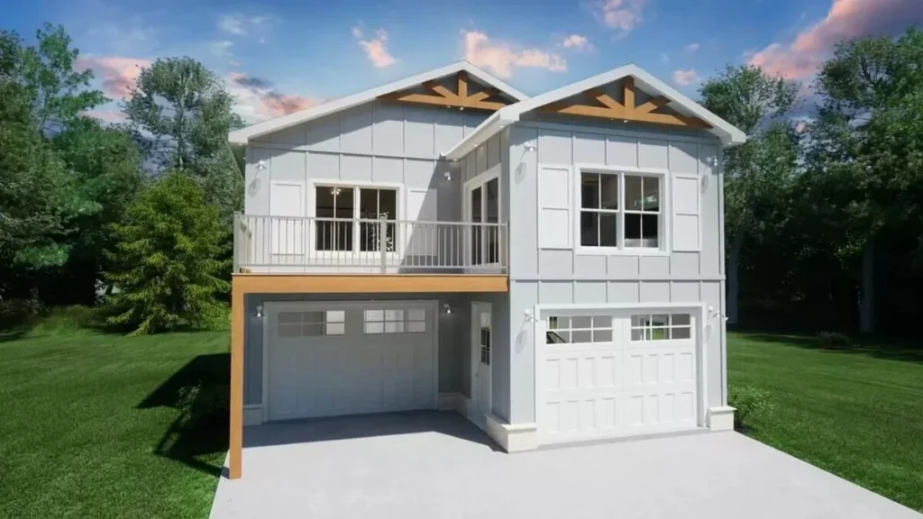 The first floor has a big 2-car garage with lots of storage space, a small bathroom, and an entryway with a built-in bench and stairs to the second floor.