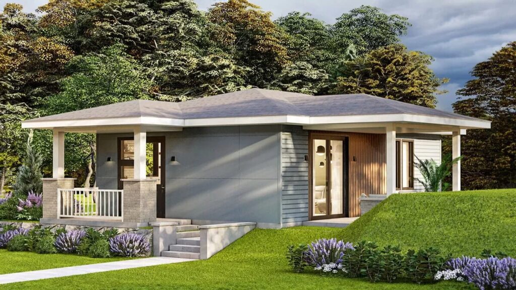 This one-bedroom cottage has a cozy and modern look with horizontal siding, concrete panels, wooden accents, and stone columns at the front porch and patio.