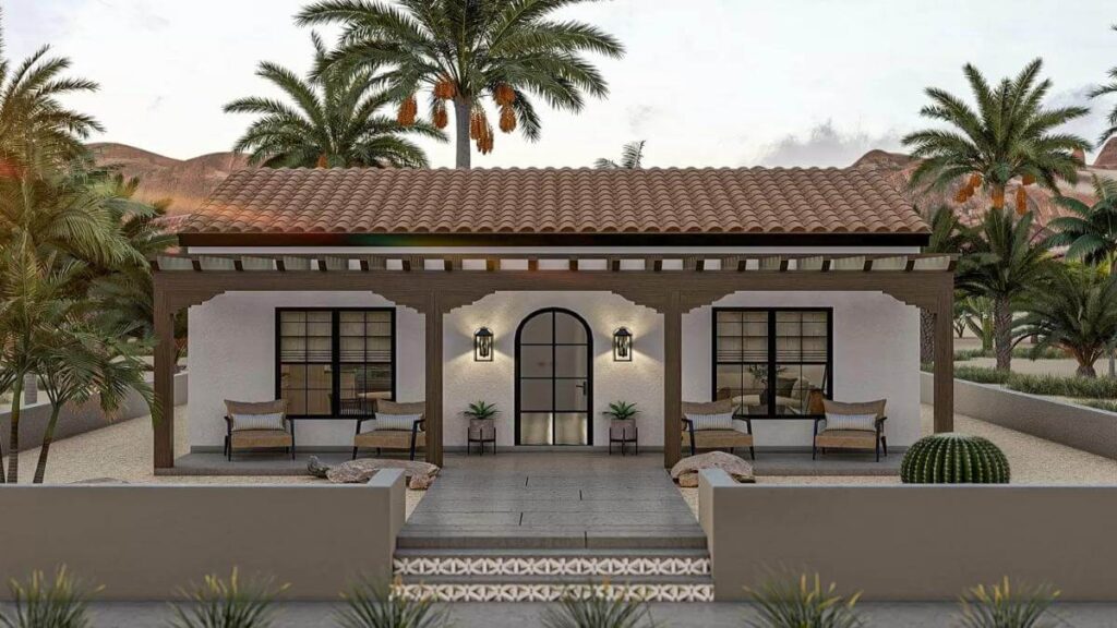 This one-bedroom Adobe house has a welcoming front with a traditional stucco outside, clay-tiled roofs, and a front porch with a pergola held up by decorative wooden posts.
