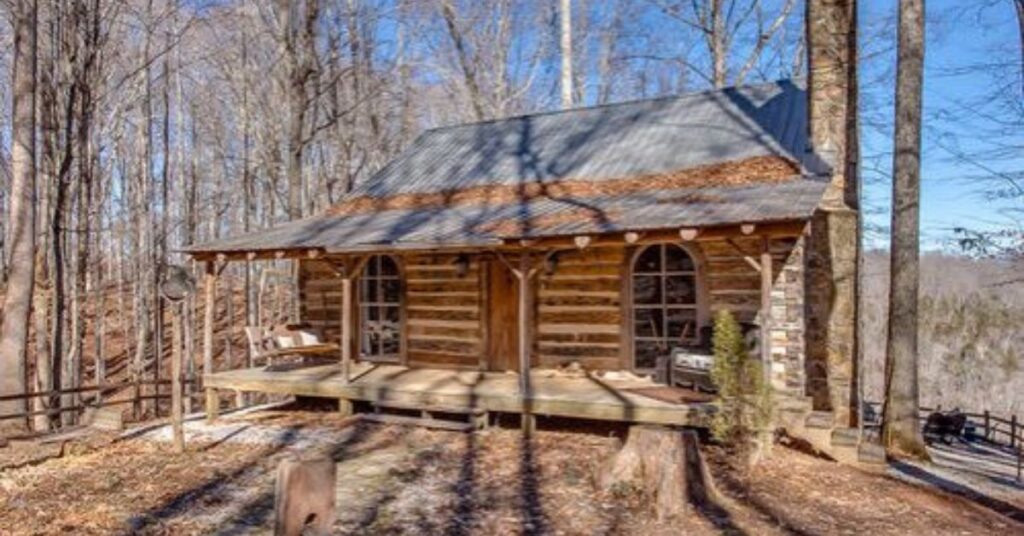The last cabin looks rustic outside, with a tin roof and a big front porch.