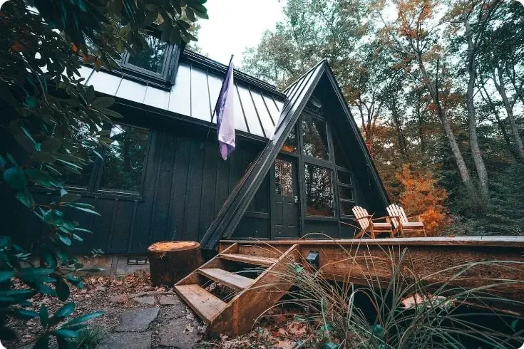 Deep in the Catskill mountains, there’s a beautiful off-grid A-frame cabin on two acres of land. It has its own private access and is surrounded by woods. The cabin is solar-powered, gets its water from a well on the property, and has a nearby spring-fed pond.